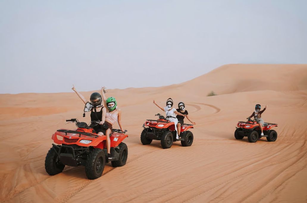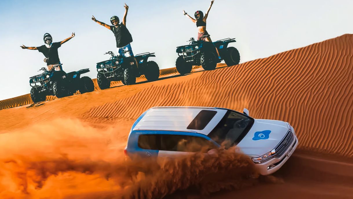 You will be picked up from your hotel or selected location in Dubai in an air-conditioned 4x4 vehicle by your guide. From there, you'll be taken comfortably to the Dubai desert, with a brief stop along the way to adjust the tyre pressure for a smooth desert drive. During this time, you can use the restroom facilities, take photos with falcons, or try optional quad biking if you're interested.
