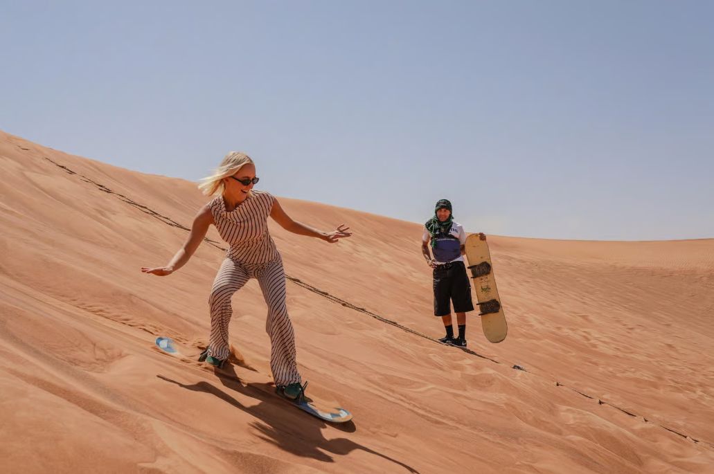 Once at the desert, get ready for an exciting session of dune bashing with trained drivers. The thrill of sliding down the dunes adds extra fun to your adventure, making it unforgettable. Afterward, try your hand at sandboarding down the sandy slopes, perfect for snapping memorable photos of the beautiful desert landscape.